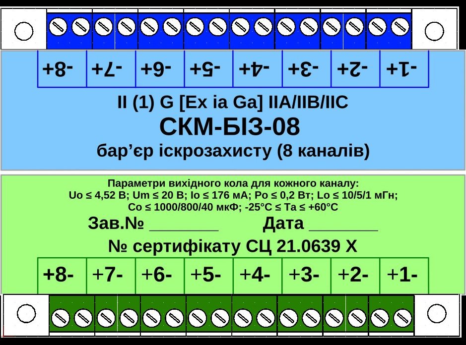 Бар’єр іскрозахисту СКМ-БІ3-08 з вхідними іскробезпечними електричними колами рівня “іа”, має маркування вибухозахисту II (1) G [Ex ia Ga] IIА/IIB/IIC, відповідає ДСТУ EN 60079-0:2017 (зі зміною 11:2017), ДСТУ EN 60079-11:2017.
